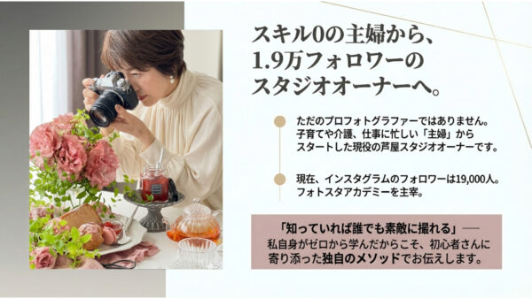 スキル0の主婦からスタートした現役の芦屋スタジオオーナーでインスタフォロワー19,000人のフォトスタアカデミーを主宰