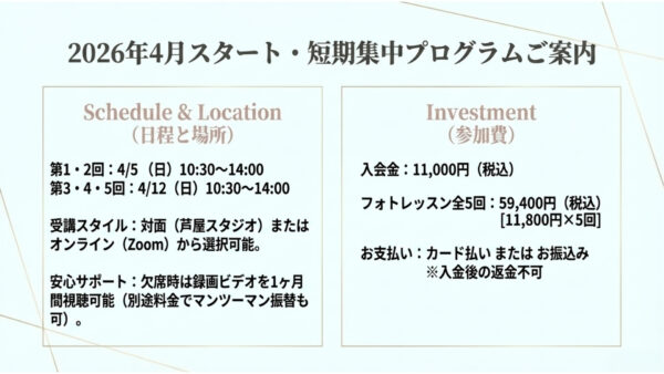 写真が3倍お洒落に撮れる✨【短期集中1カ月/5回初心者さんのフォトレッスンPhoto Step1】